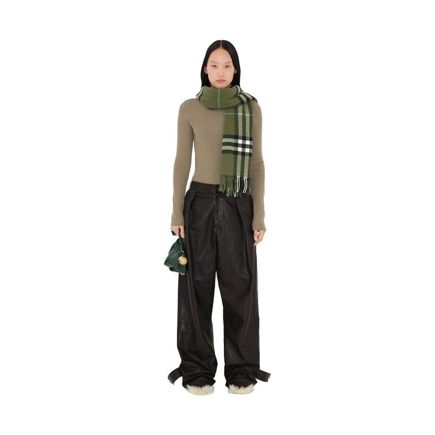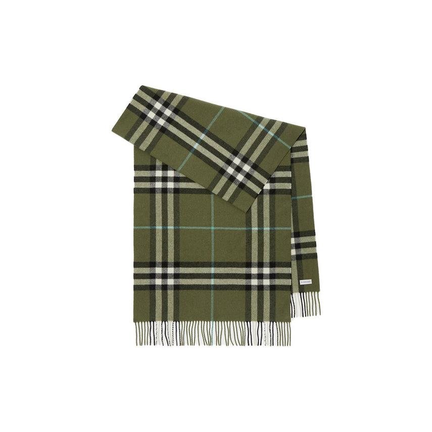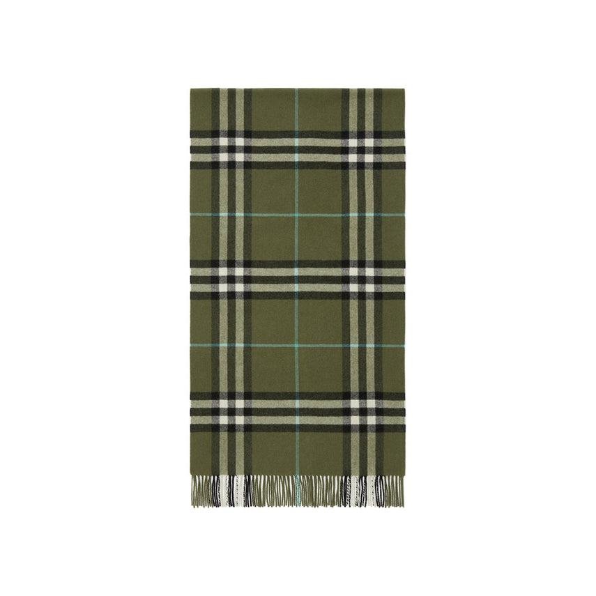 • The iconic Burberry Check cashmere scarf, woven on traditional looms at a 200-year-old Scottish mill. The fabric is washed in local spring water and brushed with thistles for an ultra-soft finish.