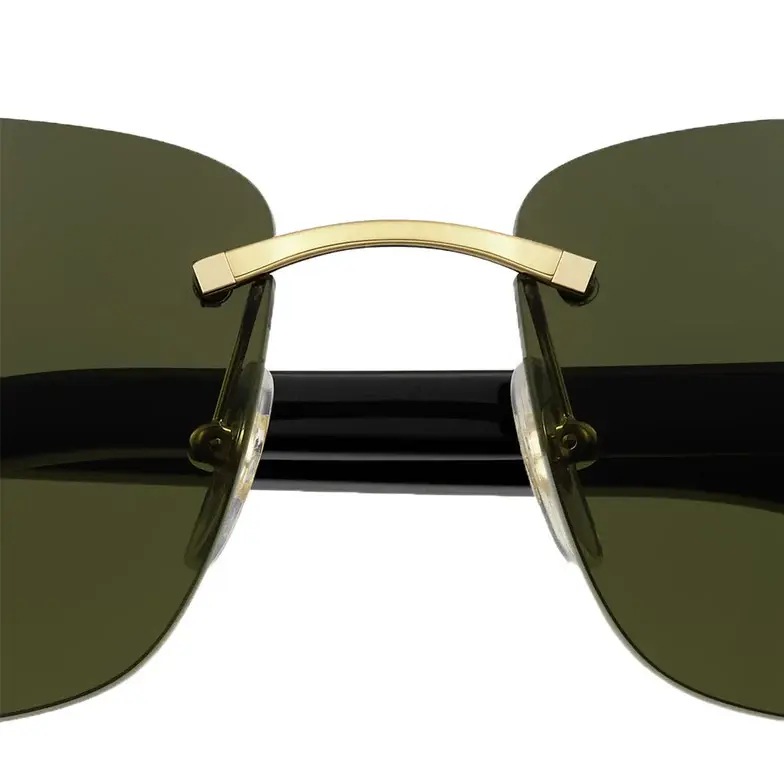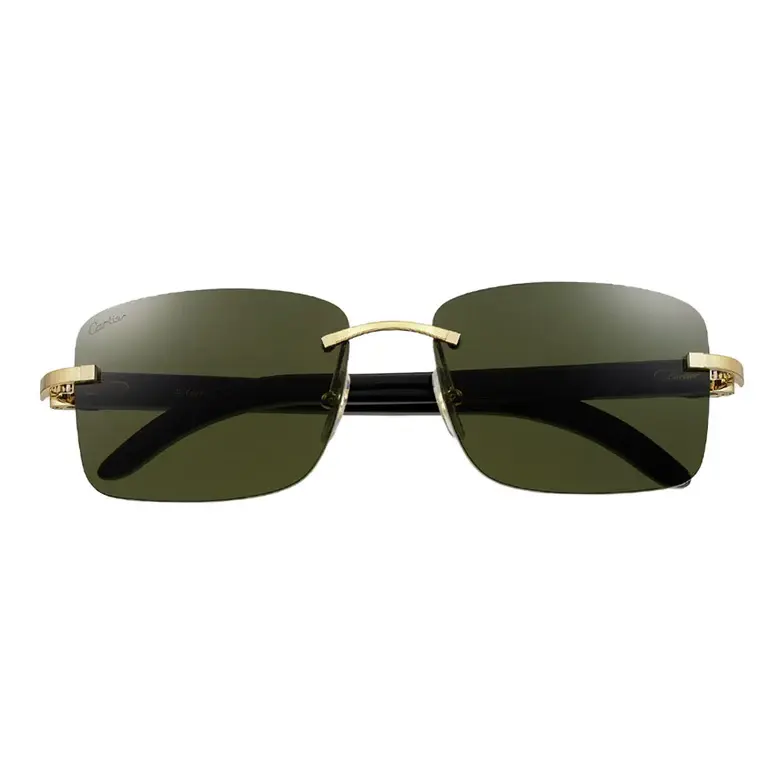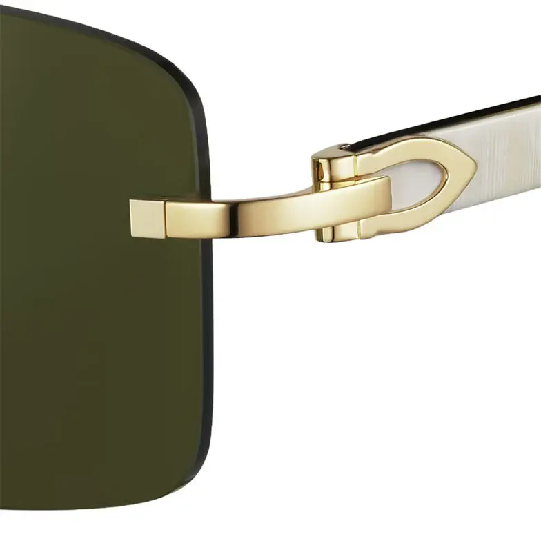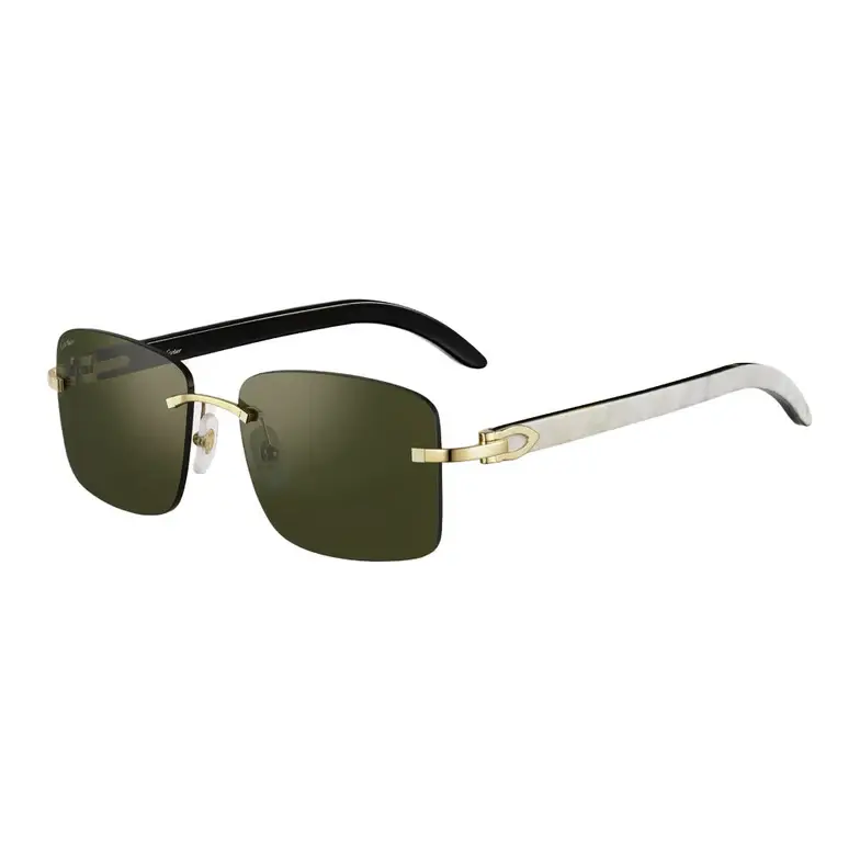 • Sunglasses in white horn with a smooth golden finish, rectangular shape, green lenses and class 3 solar protection. Dimensions: lenses 58 mm, bridge 17 mm, temples 140 mm.