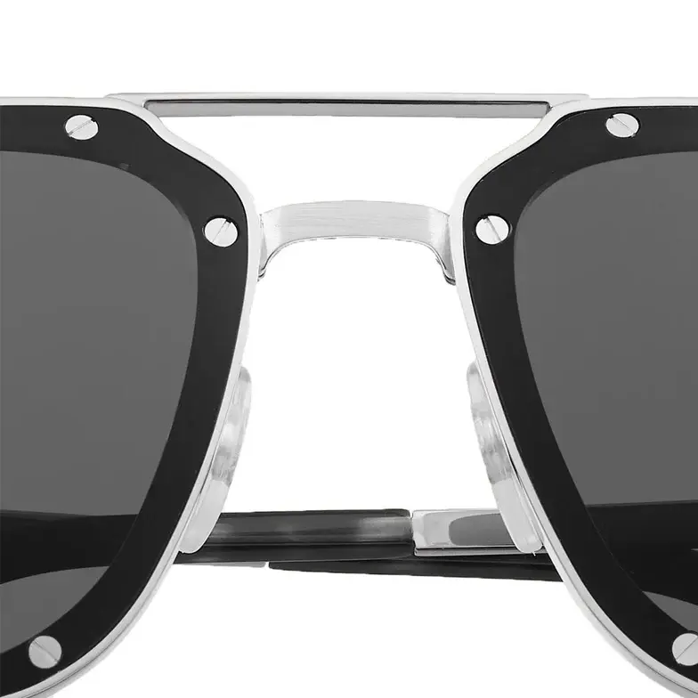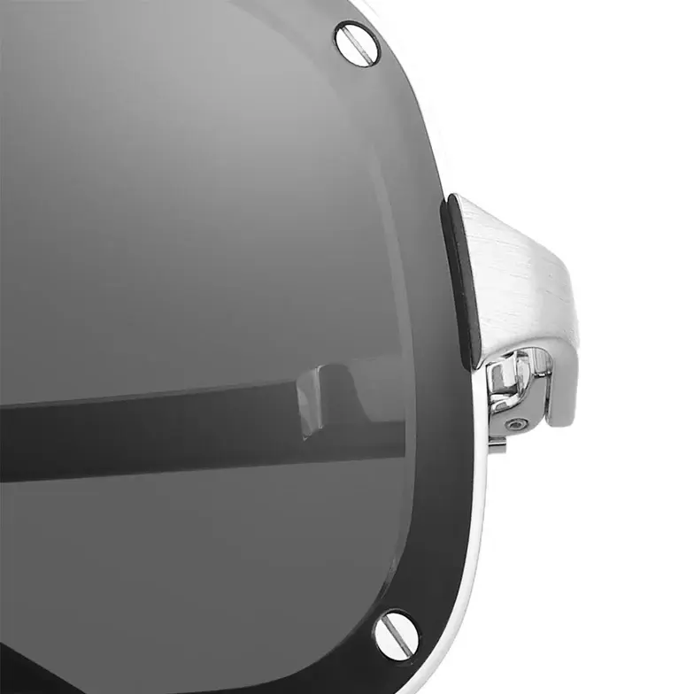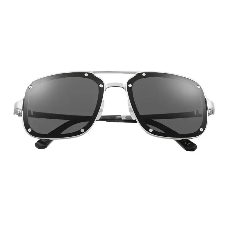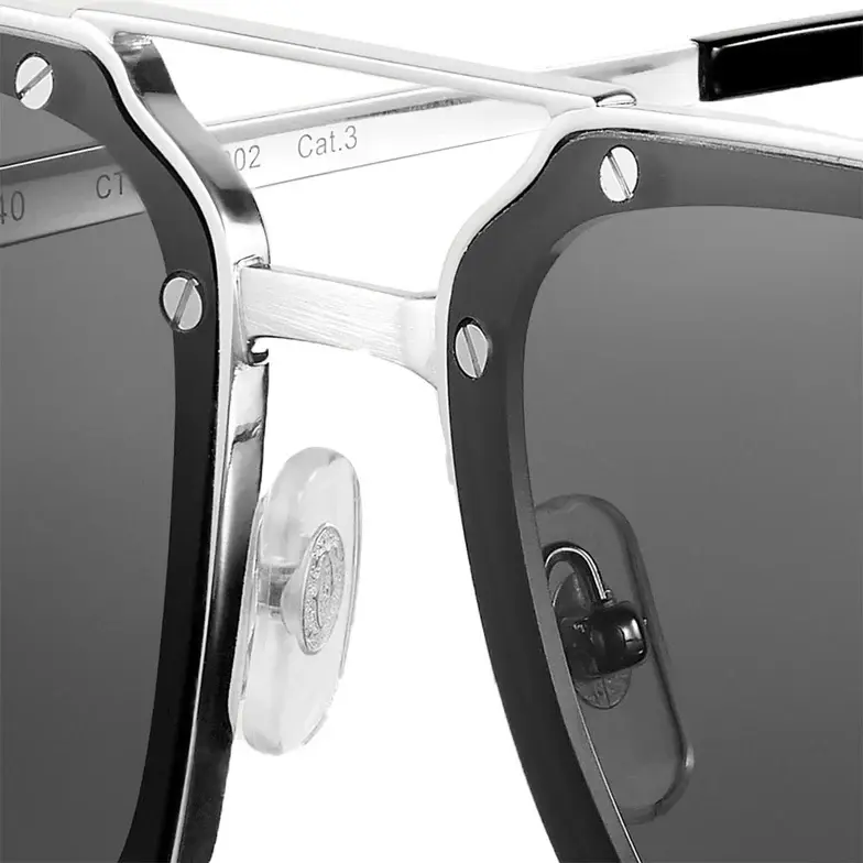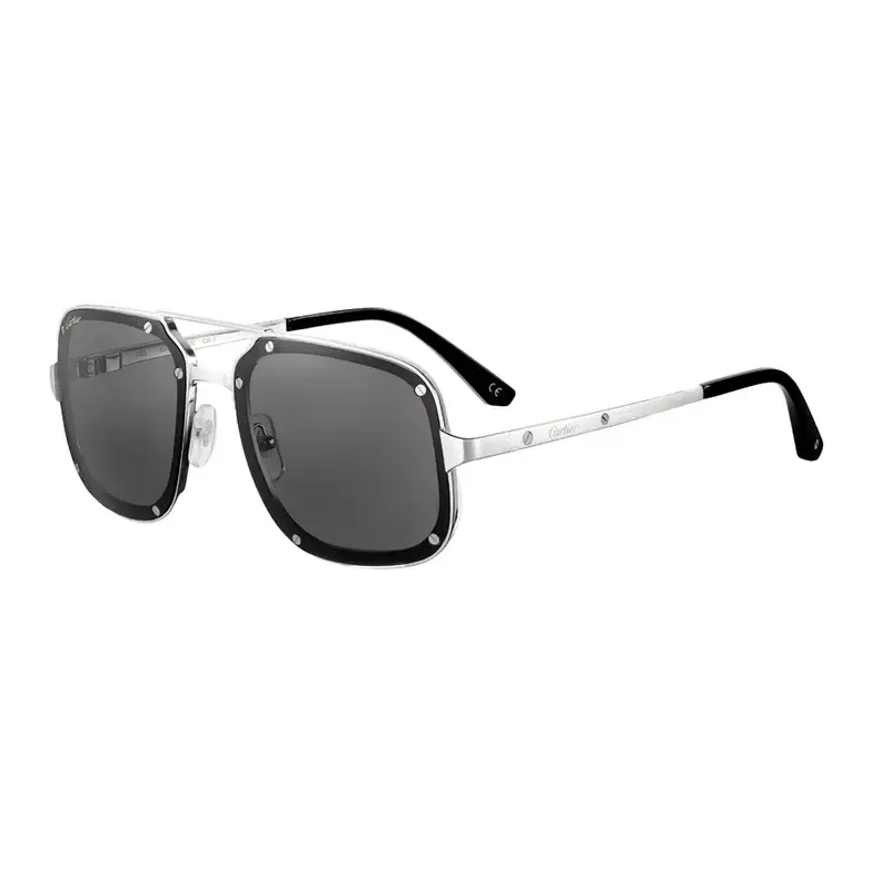 • Santos de Cartier sunglasses in smooth and brushed platinum-finish metal, rectangular shape and gray lenses. Dimensions: lenses 58 mm, bridge 17 mm, temples 140 mm.