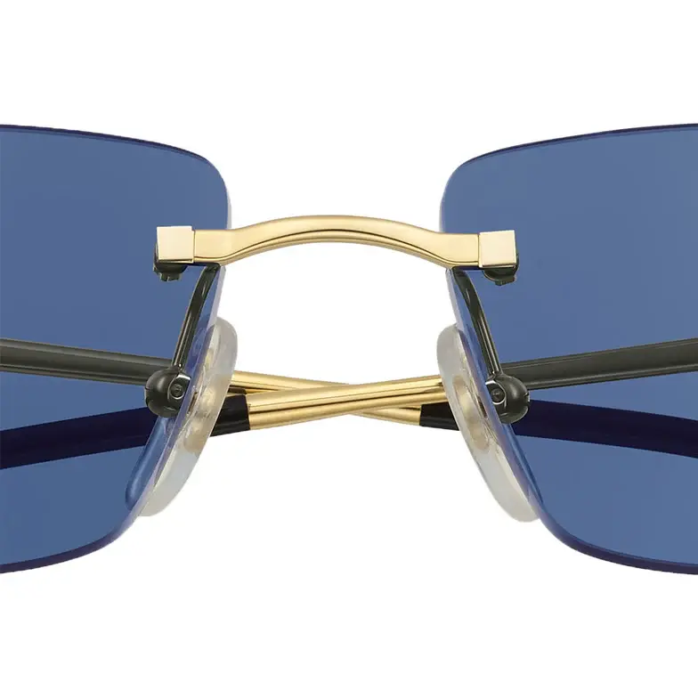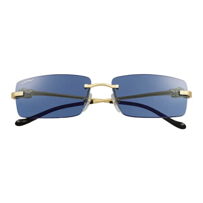 anthère de Cartier sunglasses, rimless metal, smooth golden finish, rectangular shape and blue lenses. Dimensions: lenses 58 mm, bridge 15 mm, temples 140 mm .