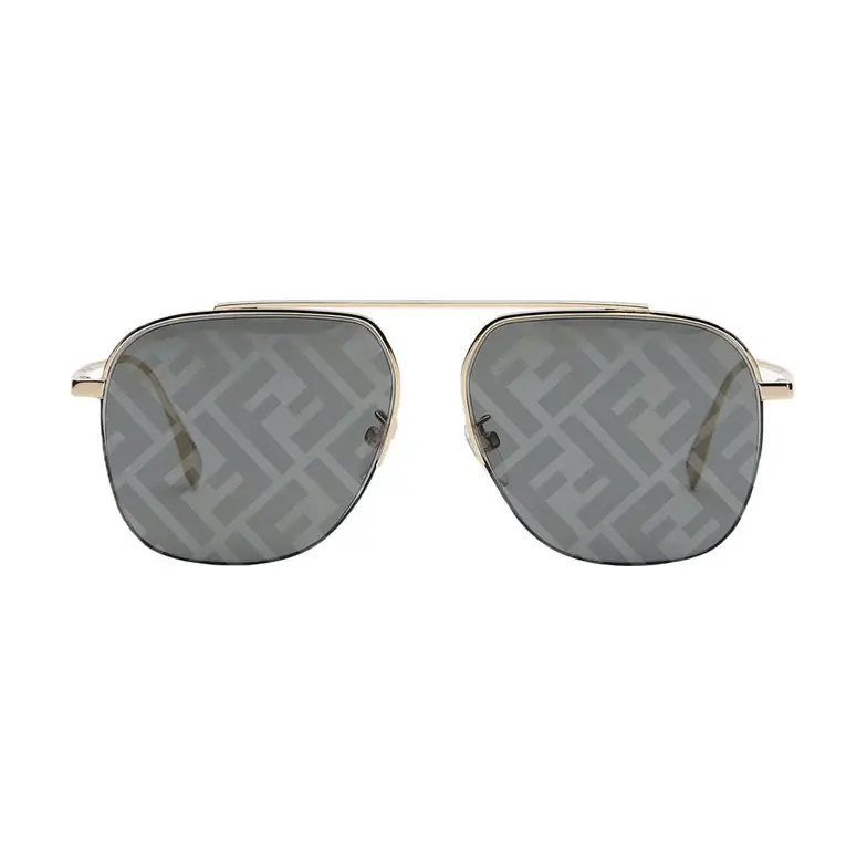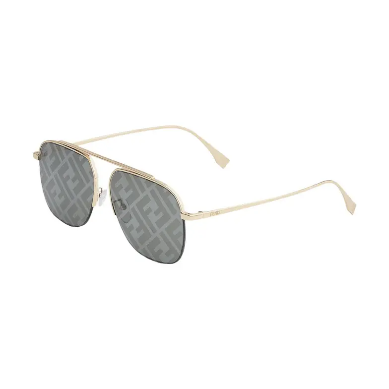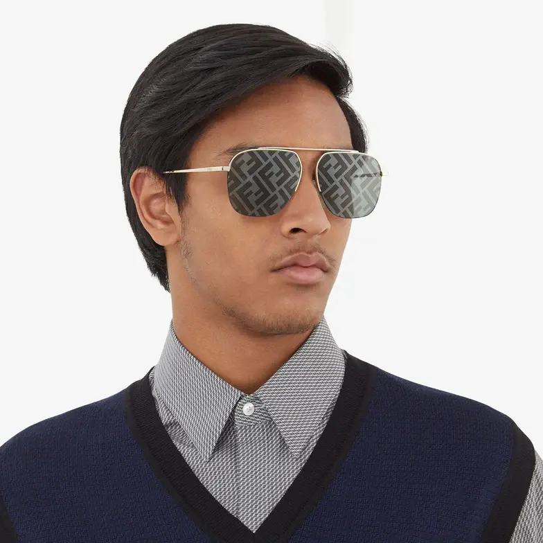 Pilot frames in gold-finish metal. The front of the frame features an FF pattern engraved on the upper part and a black metal thread on the lower edge. Gray lenses with all-over silver mirror-effect FF logo. Adjustable nose pads branded with the Fendi logo.
