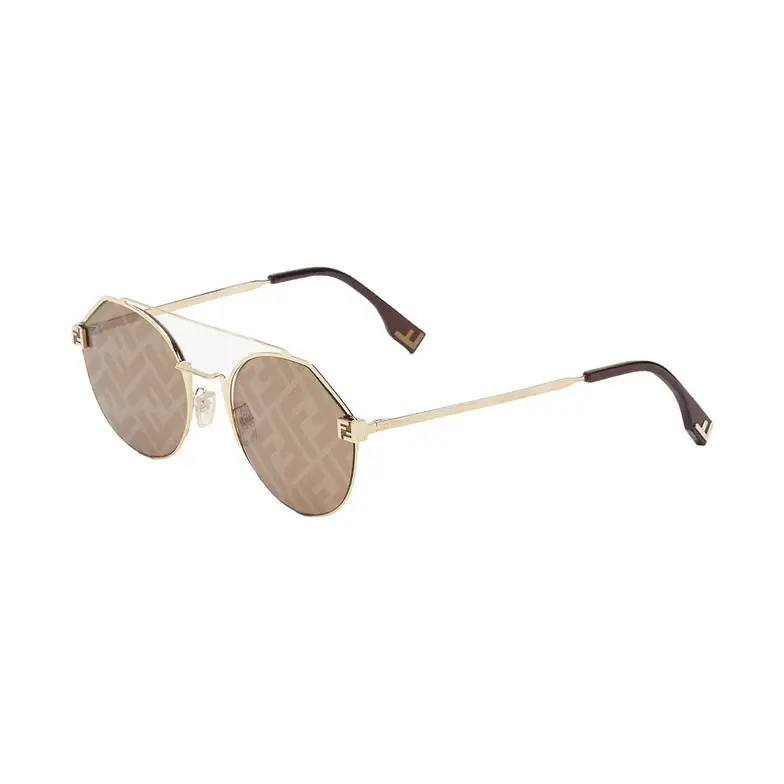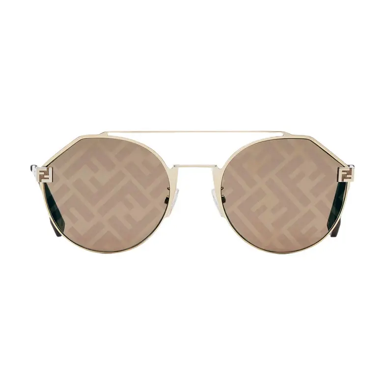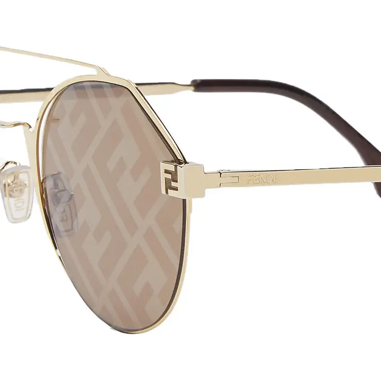 Round sunglasses in gold-colored metal. Front with a double bridge and customized hinges with an FF motif. Slender temples and FF logo. Brown lenses with FF motif. Adjustable nose pads.