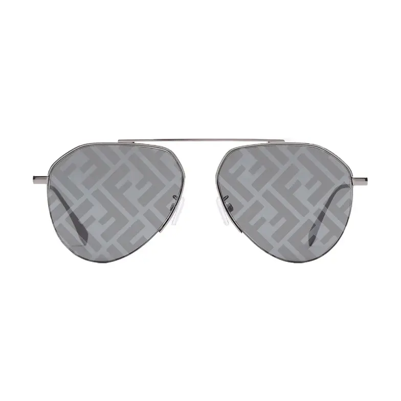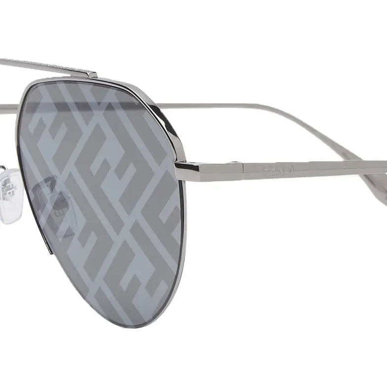 Pilot sunglasses in ruthenium-colored metal. The front features an FF pattern engraved on the upper part. Gray lenses with all-over silver mirror-effect FF logo. Adjustable nose pads branded with the Fendi logo.