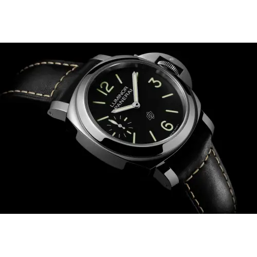 Blue sun-brushed with luminous Arabic numerals and hour markers. Small seconds at 9 o'clock