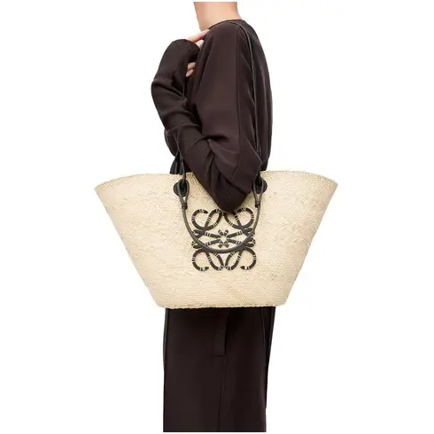 A traditional basket bag with a classic handwoven body, tubular calfskin straps and calfskin top handles and an embroidered calfskin Anagram. This version is crafted in iraca palm which is cultivated, harvested, and sun-dried in Colombia where it is then woven by women artisans from Corporación Oficio y Arte, an organisation guided by fair trade principles.