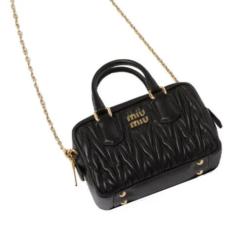 • Miu Miu revisits classic codes, plays with iconic shapes, and reimagines functions. $ Made of matelassé nappa leather, a Miu Miu hallmark, this mini Arcadie bag blends day and night, becoming a versatile accessory of great modernity and elegance. Sophisticated color details brighten the bag.