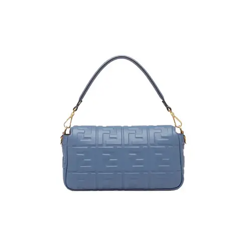 • Iconic medium Baguette bag made of blue soft nappa leather with a three-dimensional texture embossed FF motif. Decorated with an FF clasp.
