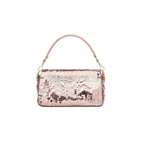 • Iconic medium Baguette bag embroidered all-over with pink metallized sequins in different shapes and sizes. Decorated with an FF clasp.