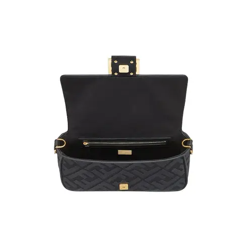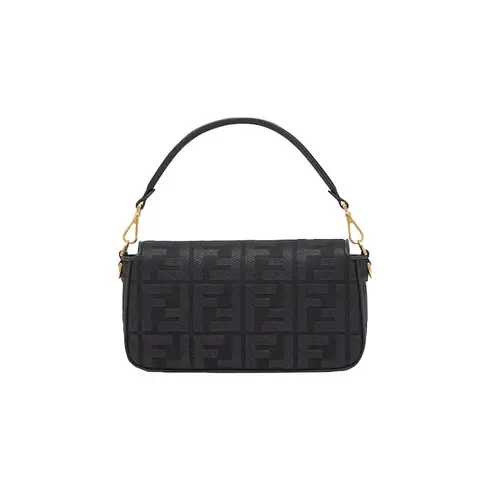 • Iconic medium Baguette bag made of black canvas with an raised FF motif created with tone on tone embroidery, trimmed in leather and adorned with an FF clasp.