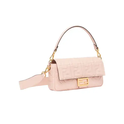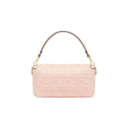 • Iconic medium Baguette bag made of soft, pink nappa leather with a three-dimensional textured embossed FF motif. Decorated with an FF clasp.