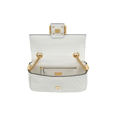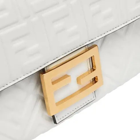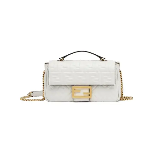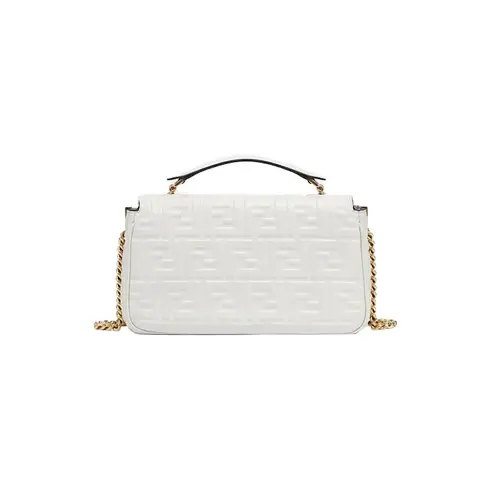 • Iconic medium Baguette bag with chain, made of soft, white nappa leather with a 3D texture FF motif. Decorated with an FF clasp.