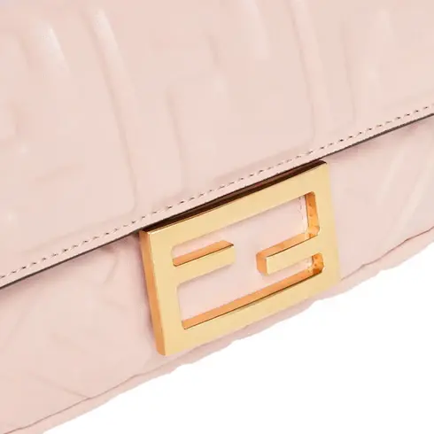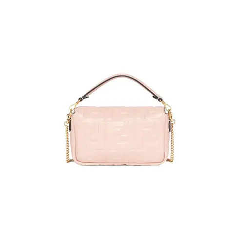 •  Iconic mini Baguette bag made of soft, pink nappa leather with a three-dimensional textured embossed FF motif. Decorated with an FF clasp.