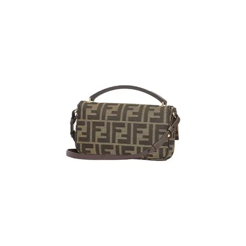 • Baguette smartphone pouch with front flap and FF magnetic button closure. Small handle, adjustable and removable shoulder strap. Made of fabric with brown jacquard FF motif. Metal accessories in a vintage-gold finish.