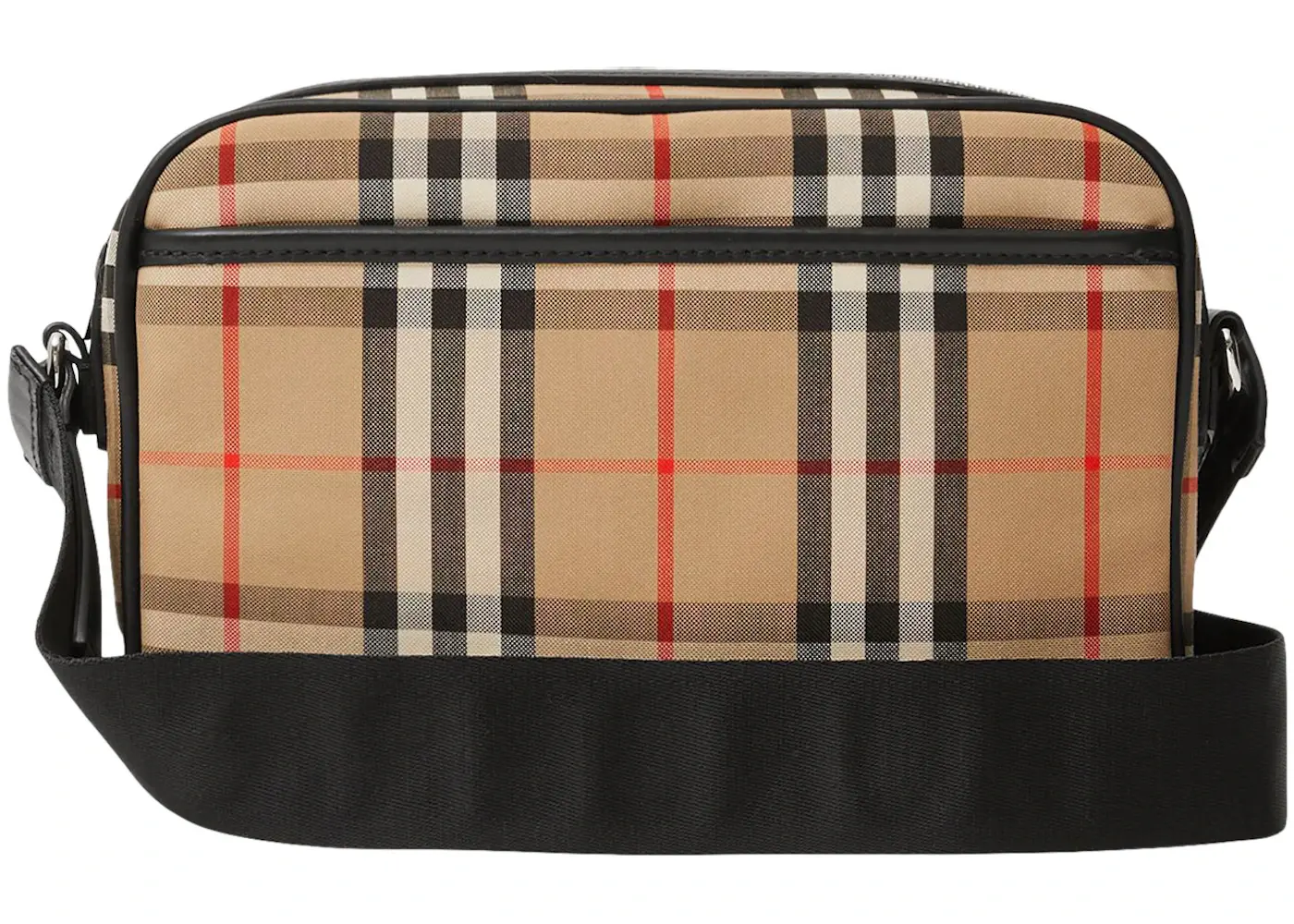 The Burberry Vintage Check and Leather Crossbody Bag Archive Beige is a bag that features the iconic Burberry check print prominently on its exterior. It also includes a webbing shoulder strap that bears the Burberry name.