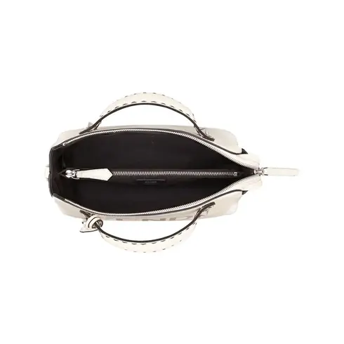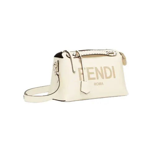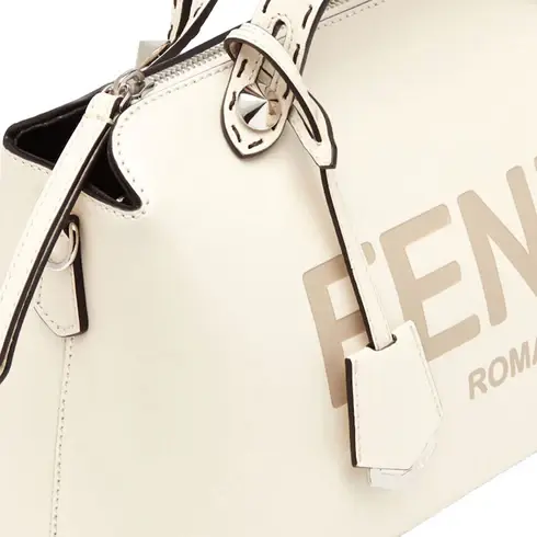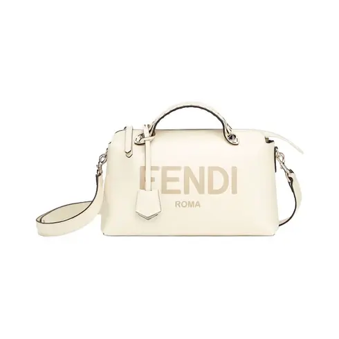 • Medium iconic By The Way Boston bag, made of white leather with hot-stamped “FENDI ROMA” and zipper closure.