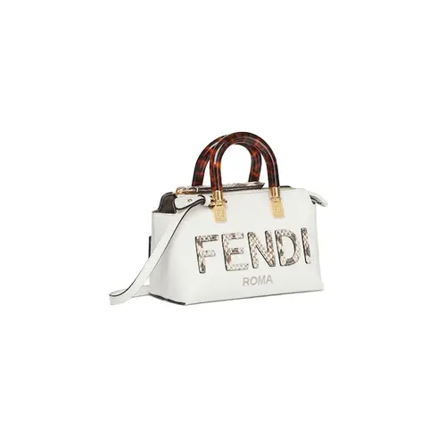 • Iconic By The Way Boston bag made of white leather with FENDI ROMA lettering appliqué in python-look printed elaphe and rigid tortoiseshell-effect plexiglass handles. Zipper closure.