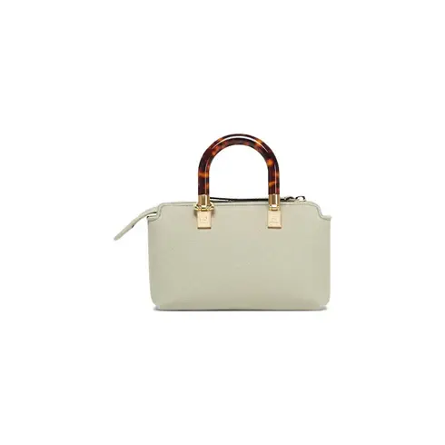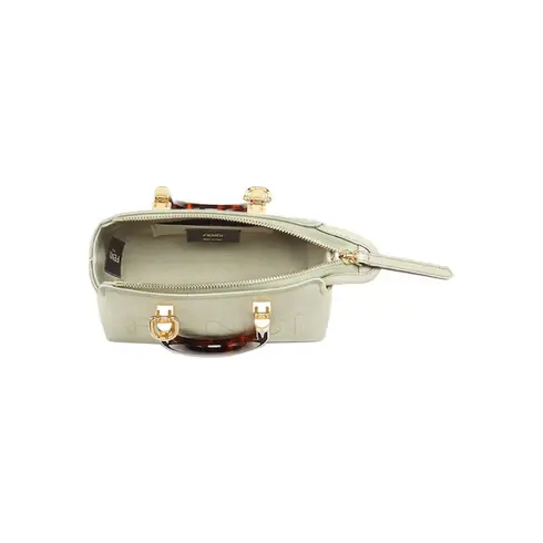 • Iconic mini By The Way Boston bag made of light green canvas with tone-on-tone raised FENDI ROMA embroidery and rigid tortoiseshell-effect plexiglass handles. Zipper closure.