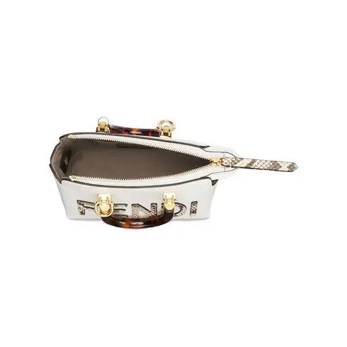 • Iconic By The Way Boston bag made of white leather with FENDI ROMA lettering appliqué in python-look printed elaphe and rigid tortoiseshell-effect plexiglass handles. Zipper closure.