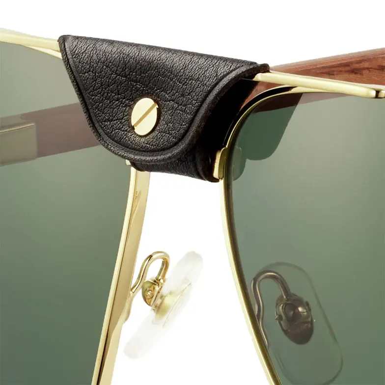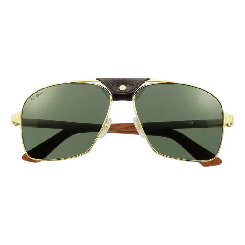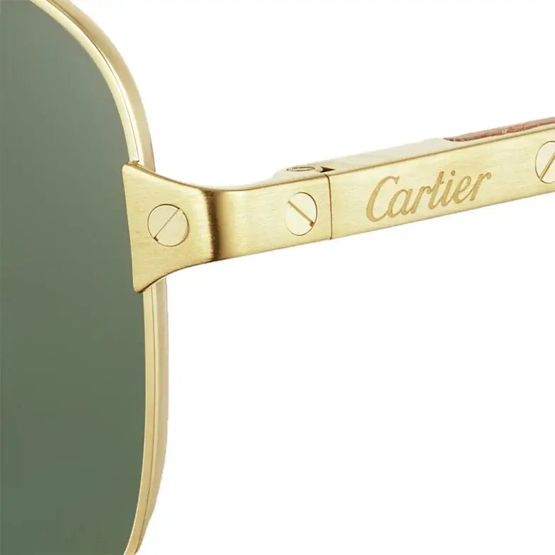 • Santos de Cartier sunglasses, rimmed metal, smooth and brushed golden finish, polarized green lenses. Dimensions: lenses 61 mm, bridge 15 mm, temples 145 mm.