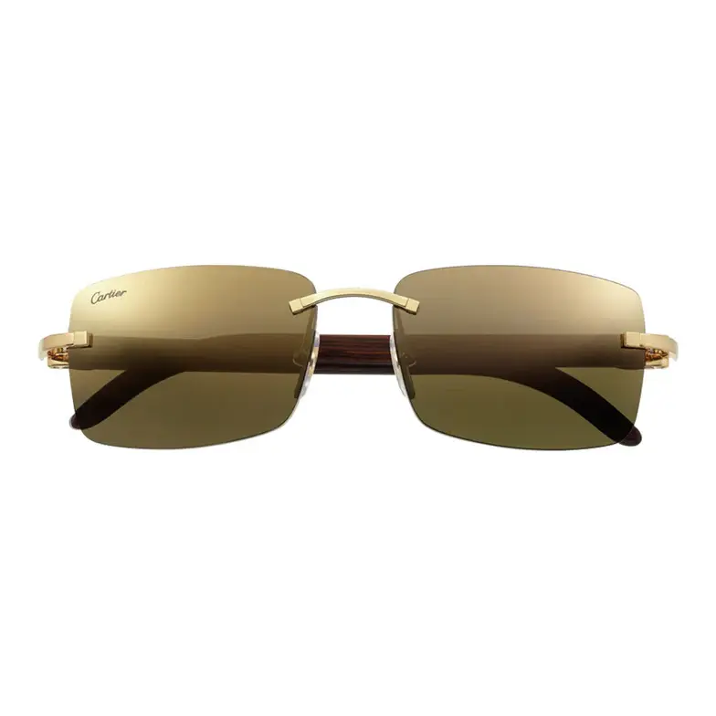 • Signature C de Cartier sunglasses in brown wood with a smooth golden finish, rectangular shape and gray lenses. Dimensions: 57 mm lenses, 17 mm bridge, 140 mm temples.