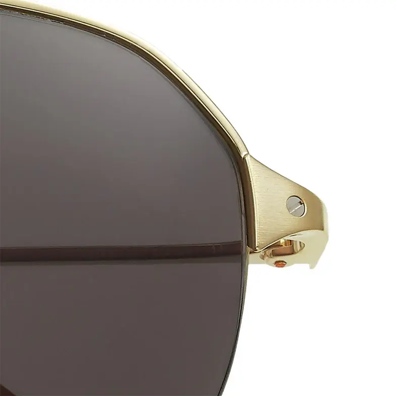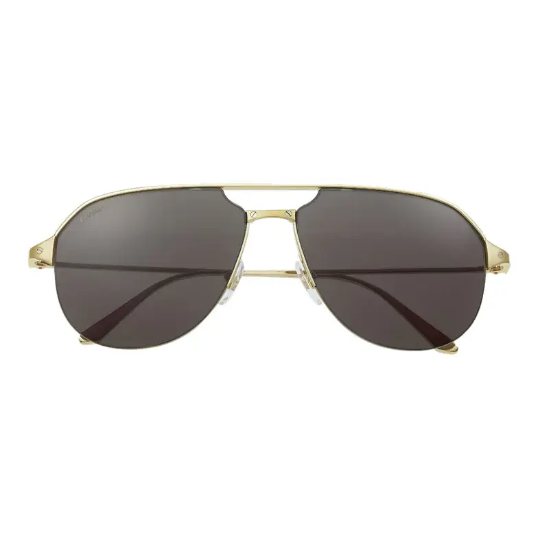 • Santos de Cartier sunglasses in smooth and brushed golden-finish metal, golden-finish metal screws, pilot shape and gray lenses. Dimensions: lenses 60 mm, bridge 15 mm, temples 140 mm.
