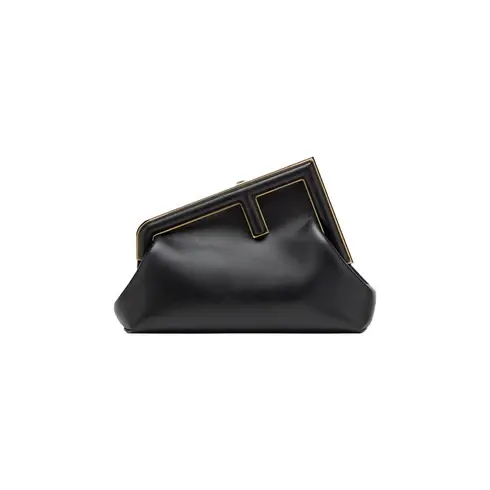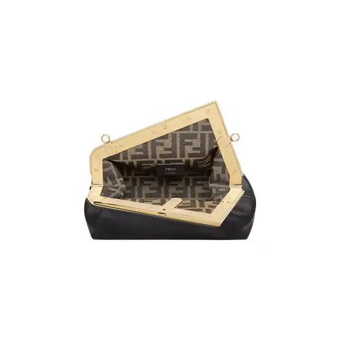 • Small Fendi First bag made of soft, black nappa leather with oversized metal F clasp with tone on tone nappa leather bands.