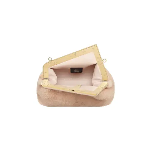 • Small Fendi First bag made of soft, pale pink mink with oversized metal F clasp bound in tone on tone nappa leather.