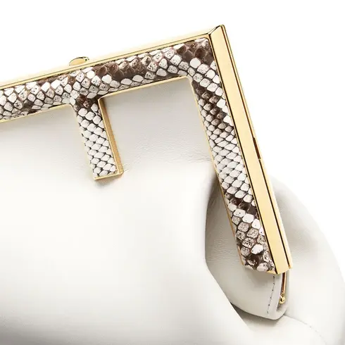 • Small Fendi First bag made of soft white nappa leather with oversized metal F clasp bound in tone on tone python leather.