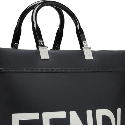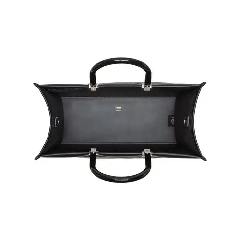 • Medium Sunshine Shopper bag made of white leather with hot-stamped “FENDI ROMA” and stiff tortoiseshell plexiglass handles.
