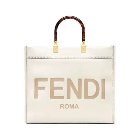 • Medium Sunshine Shopper bag made of white leather with hot-stamped “FENDI ROMA” and stiff tortoiseshell plexiglass handles.