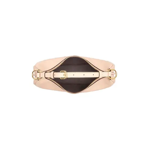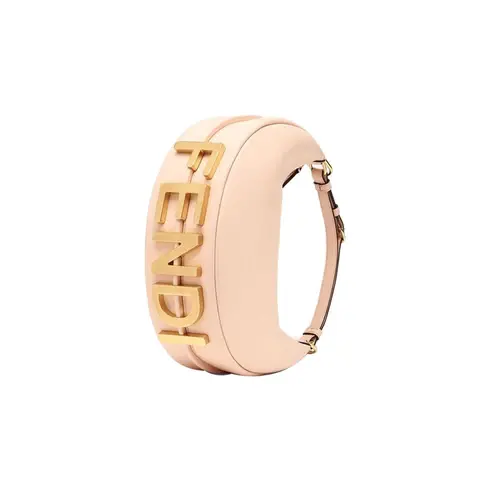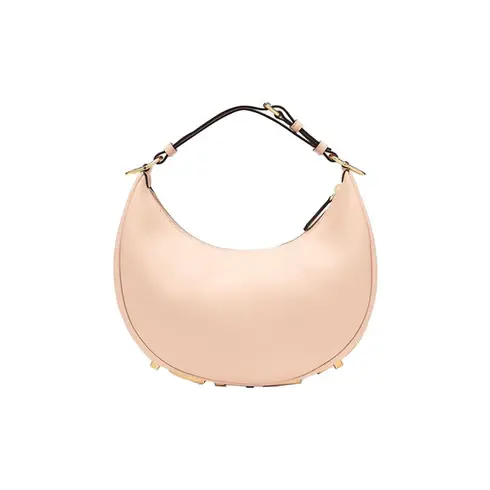 • Small hobo bag made of soft pale pink leather, with vintage gold metal FENDI lettering visible when the bag is worn under the arm.