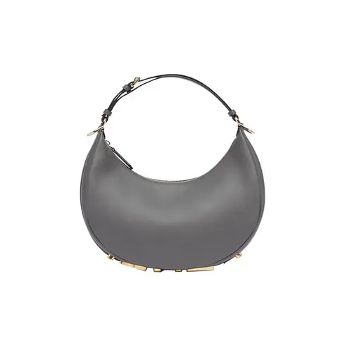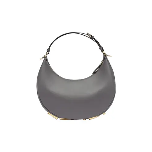 • Small hobo bag made of soft, fuchsia leather, decorated with vintage gold metal FENDI lettering visible when wearing the bag under the arm.