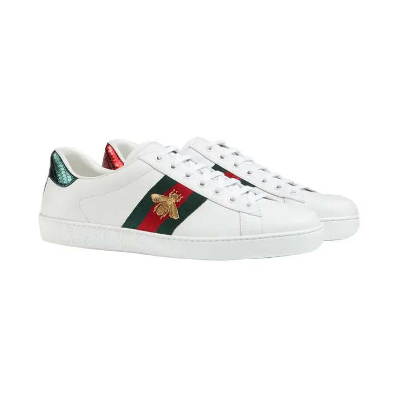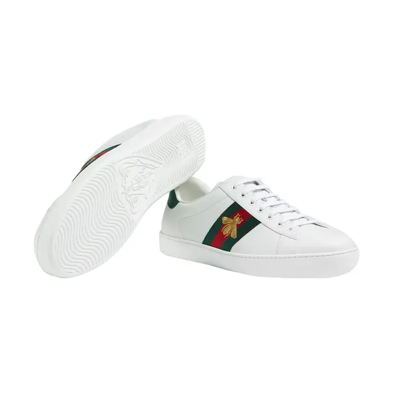 • White leather with red leather detail on the heel of one shoe and green on the other