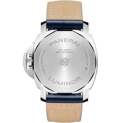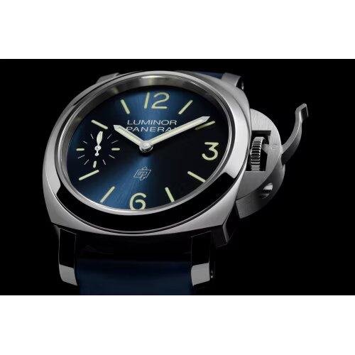 Blue sun-brushed with luminous Arabic numerals and hour markers. Small seconds at 9 o'clock