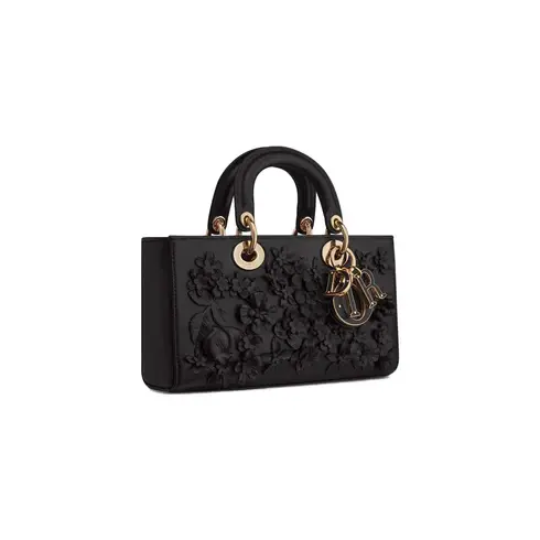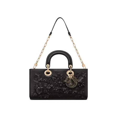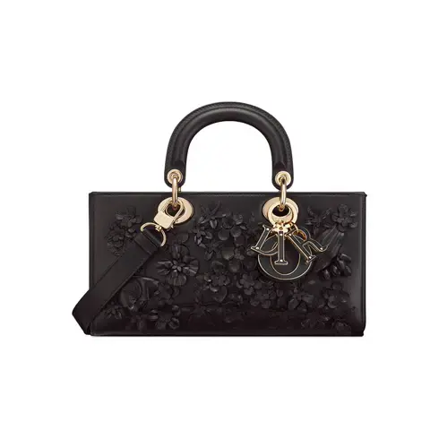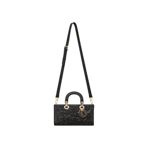 • Revealed at the Fall-Winter 2023-2024 fashion show, the Lady D-Joy bag captures the House's vision of elegance and beauty by showcasing the iconic streamlined aesthetic of the Lady Dior line. Honoring the House's unique savoir-faire, the black lambskin style displays meticulously crafted and delicately hand-embroidered flowers. The D.I.O.R. charms, adorned in tonal leather, enhance its silhouette. Featuring one removable chain strap and another adjustable and removable leather strap, the medium Lady D-Joy bag can be carried by hand, worn over the shoulder or crossbody as a daily companion.