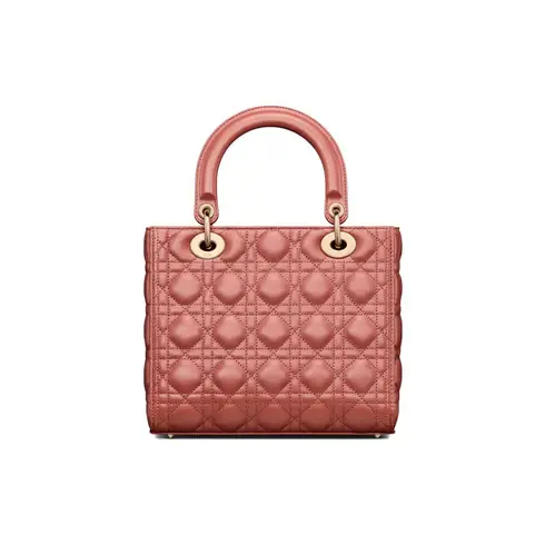 • The Lady Dior bag embodies Dior's vision of elegance and beauty. Sleek and refined, the timeless yet modern style is crafted in rust-colored lambskin with Cannage stitching, creating the instantly recognizable quilted texture. The pale gold-finish metal D.I.O.R. charms further embellish its silhouette. Featuring a thin, removable leather shoulder strap, the medium Lady Dior bag can be carried by hand or worn crossbody.