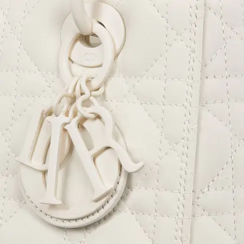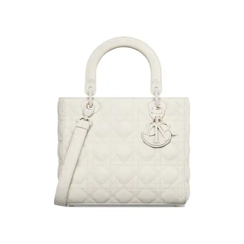 • The Lady Dior bag epitomizes the House's vision of elegance and beauty. Sleek and refined, the timeless yet relevant style is crafted in latte ultramatte calfskin with Cannage stitching, creating the instantly recognizable quilted texture. The tonal metal D.I.O.R. charms complete and illuminate the silhouette. Featuring a thin, removable leather shoulder strap, the medium Lady Dior bag can be carried by hand, worn over the shoulder or crossbody.
