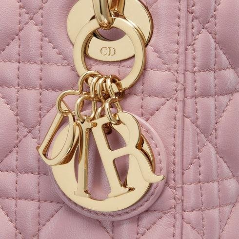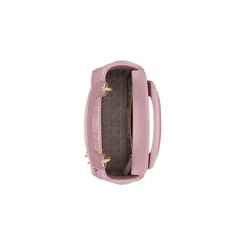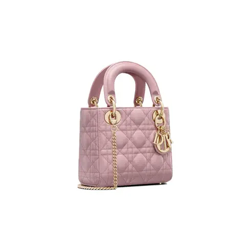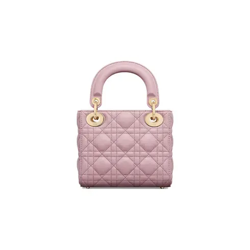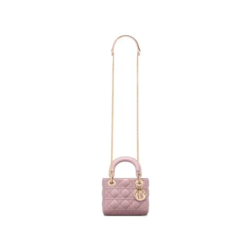 • The Lady Dior bag embodies the House's vision of elegance and beauty. Sleek and refined, the timeless style is crafted in antique pink lambskin with Cannage stitching, creating the instantly recognizable quilted texture, while the pale gold-finish metal D.I.O.R. charms further embellish its silhouette. Featuring a removable chain strap, the miniature Lady Dior bag can be carried by hand or crossbody as an ideal evening wear companion.