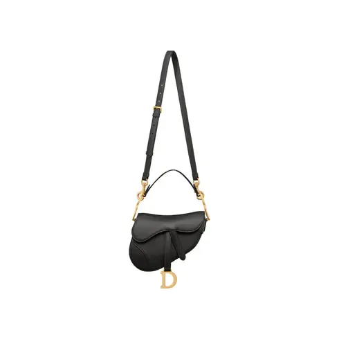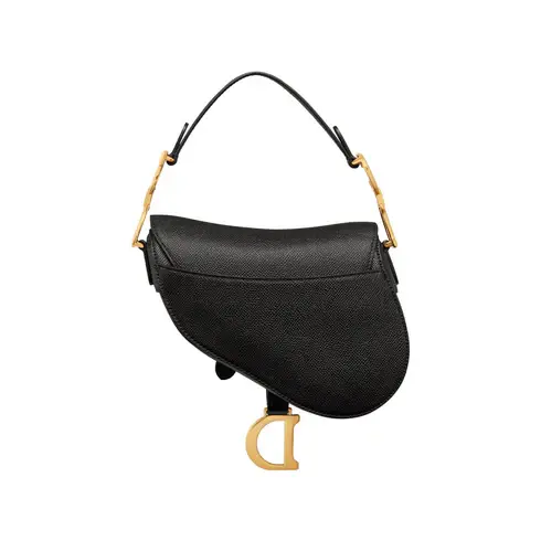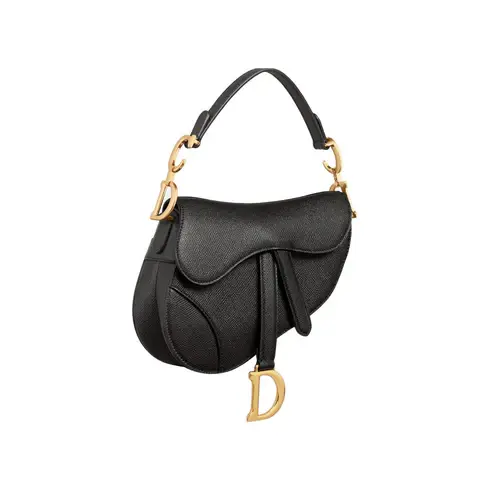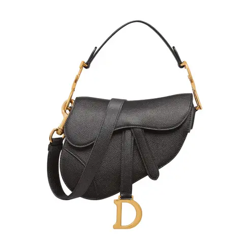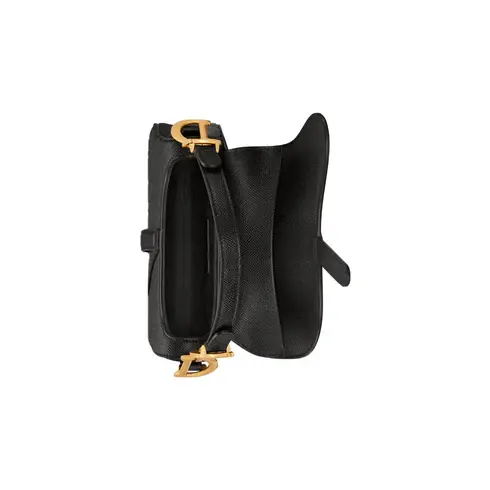 • Maria Grazia Chiuri brings a fresh update to the iconic Saddle bag. Crafted in black grained calfskin, the legendary design features a Saddle flap with a D stirrup clasp on a magnetic strap with pulls, as well as an antique gold-finish metal CD signature on either side of the strap. Equipped with a thin, adjustable and removable shoulder strap, the miniature Saddle bag may be carried by hand, worn over the shoulder or crossbody.