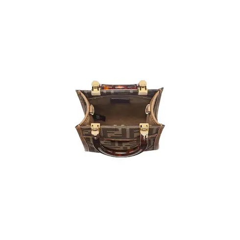 • Mini Sunshine Shopper bag made of brown FF jacquard motif fabric with stiff tortoiseshell-effect plexiglass handles.