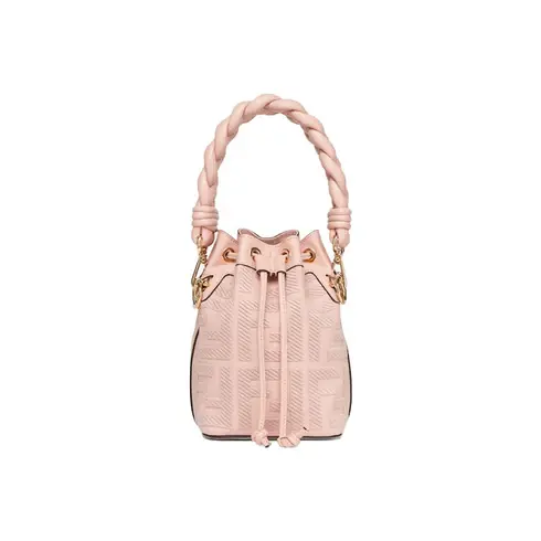 • Small Mon Tresor bucket bag made of pink canvas with a tone on tone raised embroidery FF motif and trimmed in tone on tone leather. Lined and with gold-finish metalware.