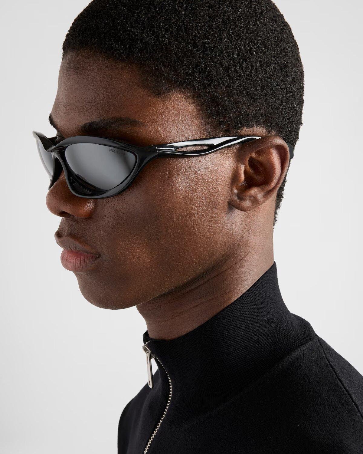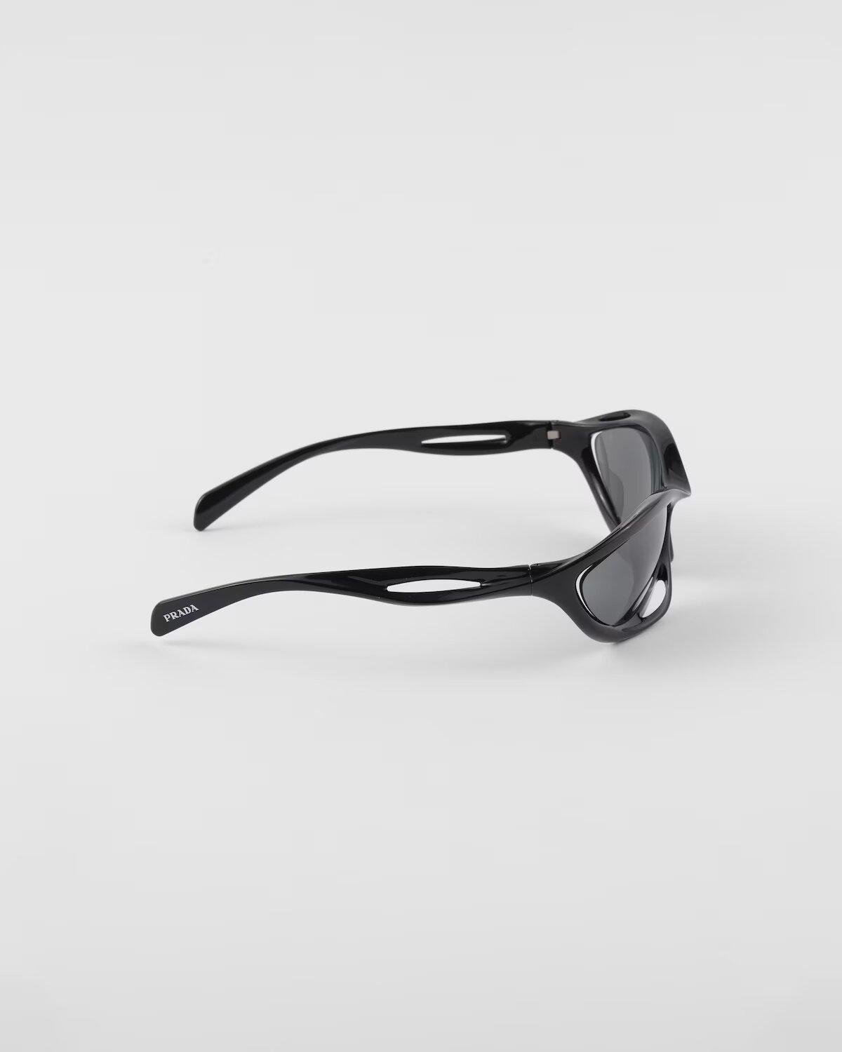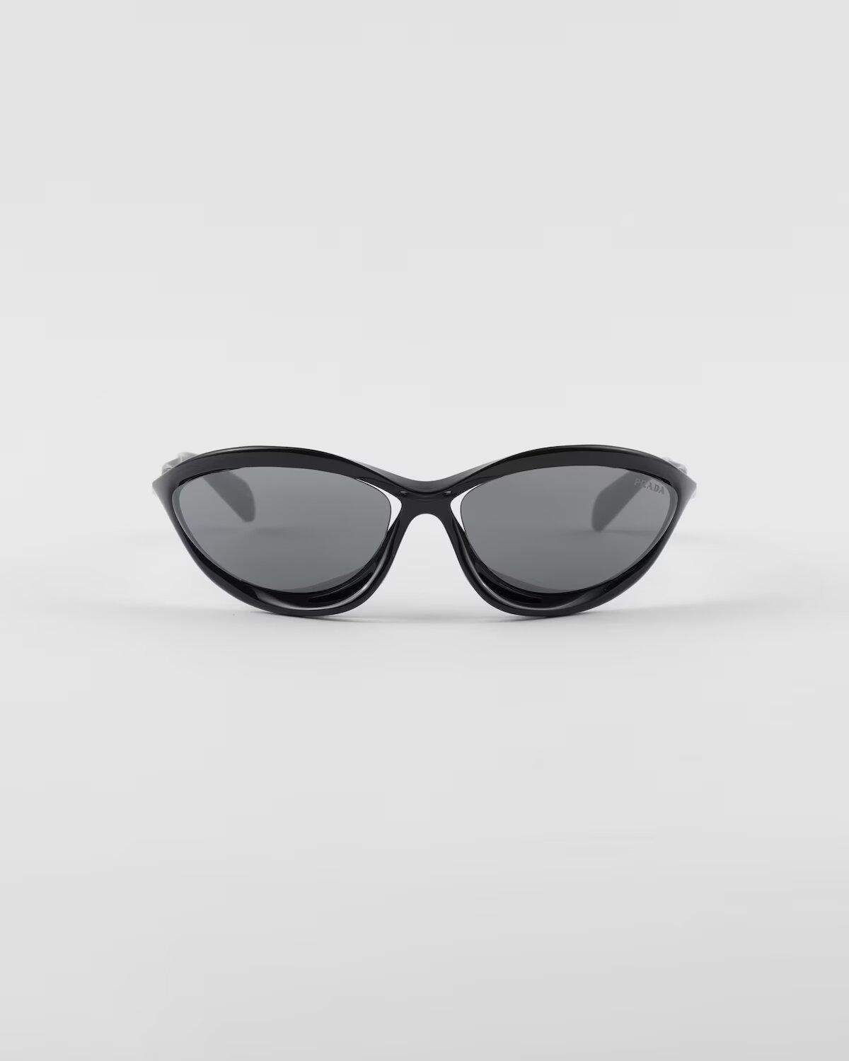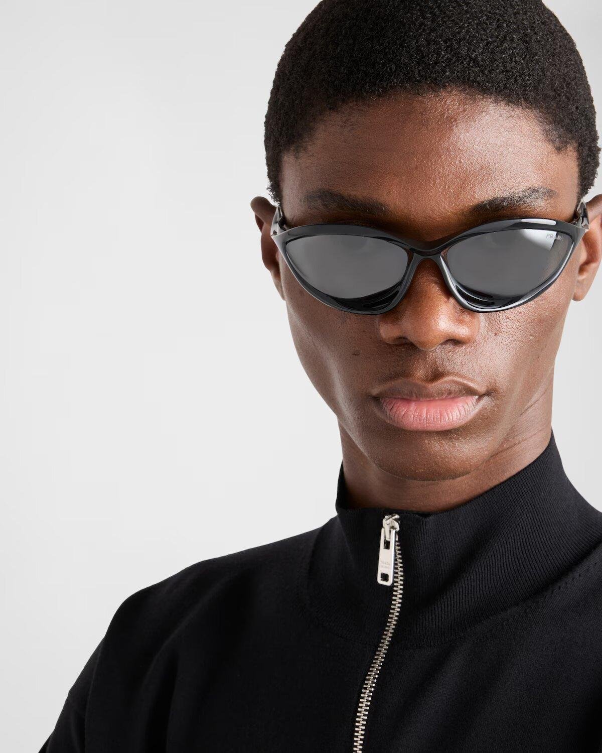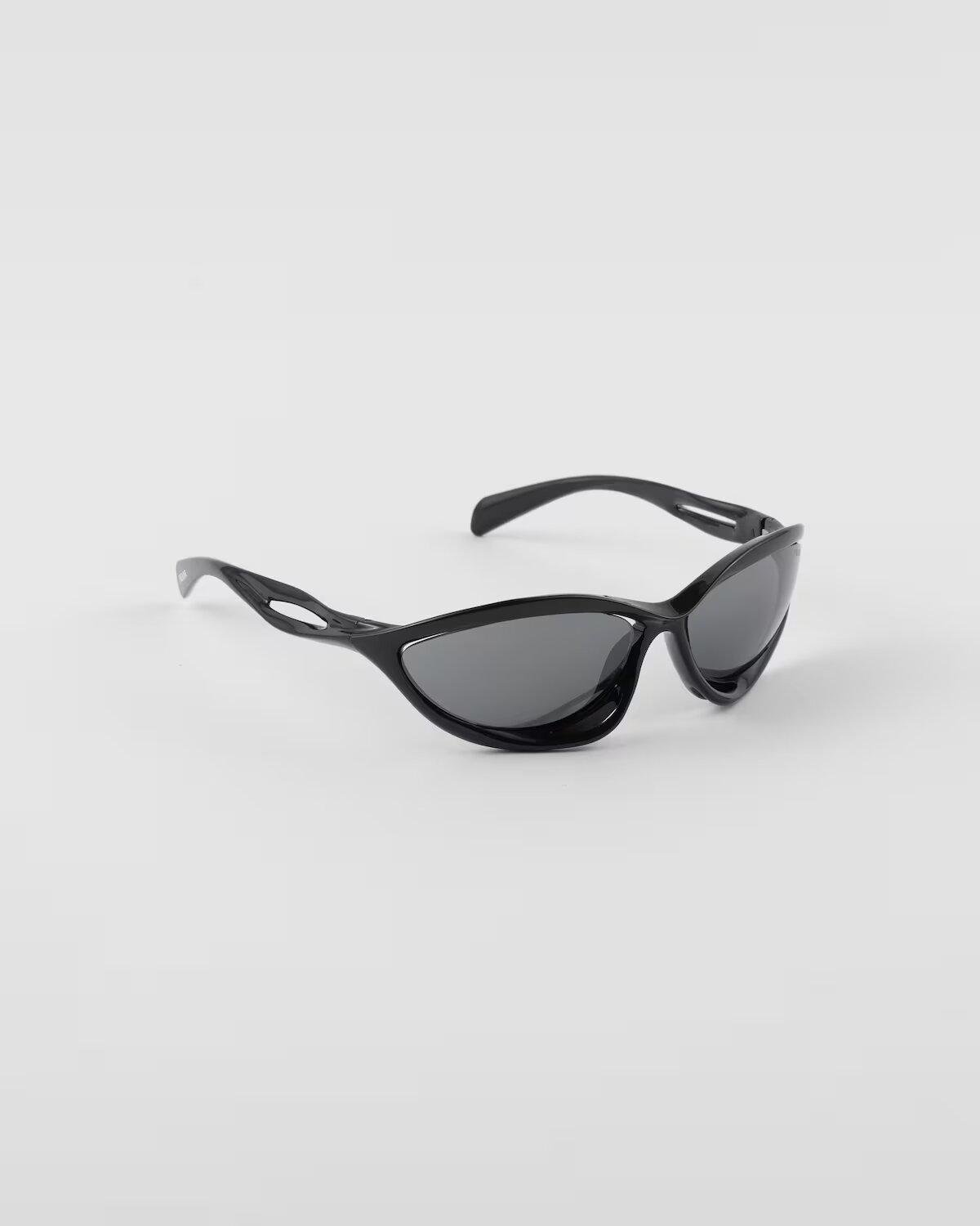 The new evolution of sunglasses from the fashion show with a futuristic and unconventional design. The enveloping and irregular frame front is made of nylon fiber with soft curves and openings that emphasize its lightness. The fluid design of the temples is embellished on the tips by the Prada lettering logo.
