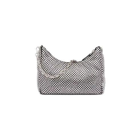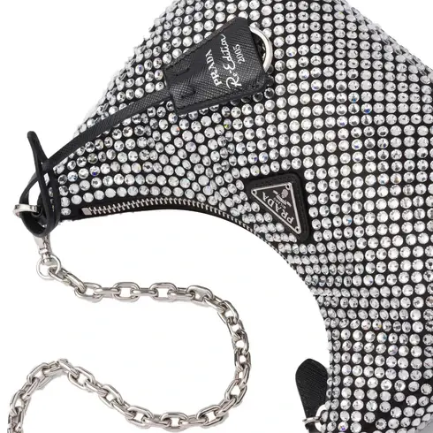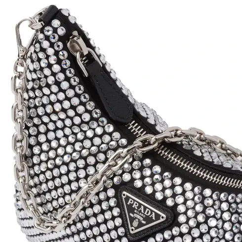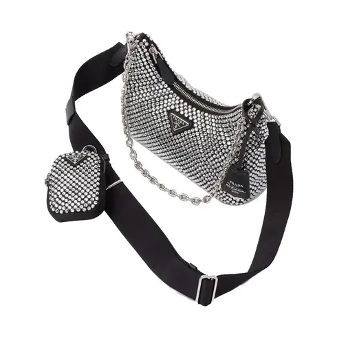 • A new interpretation of an iconic Prada style, the sparkling Re-Edition 2005 mini-bag is characterized by the all-over crystal embellishment that gives it precious allure. The bag, which comes with a coordinated pouch that hooks to the strap, can be worn in different ways thanks to the adjustable woven tape shoulder strap and chain handle.
