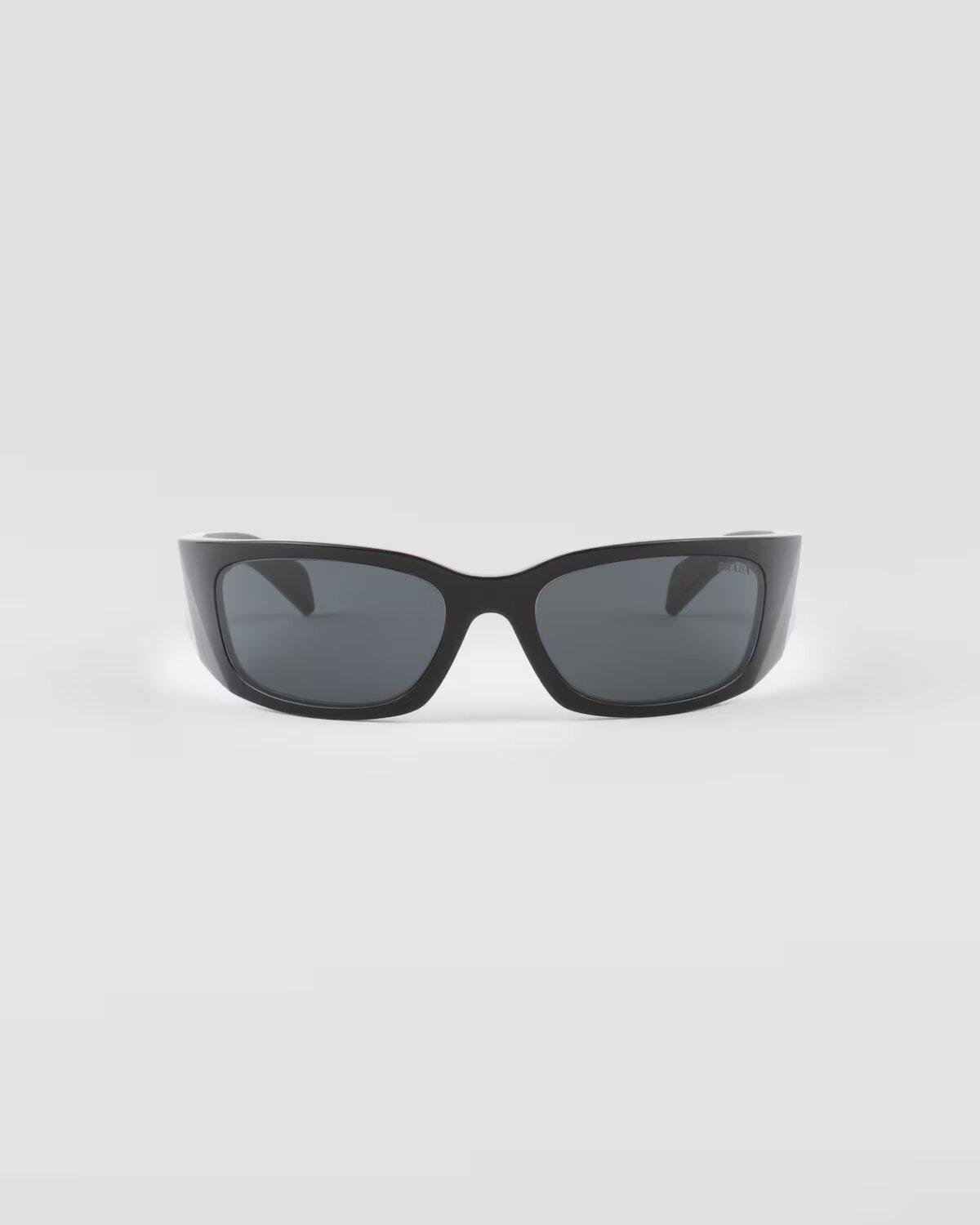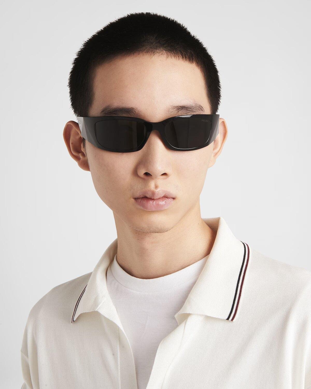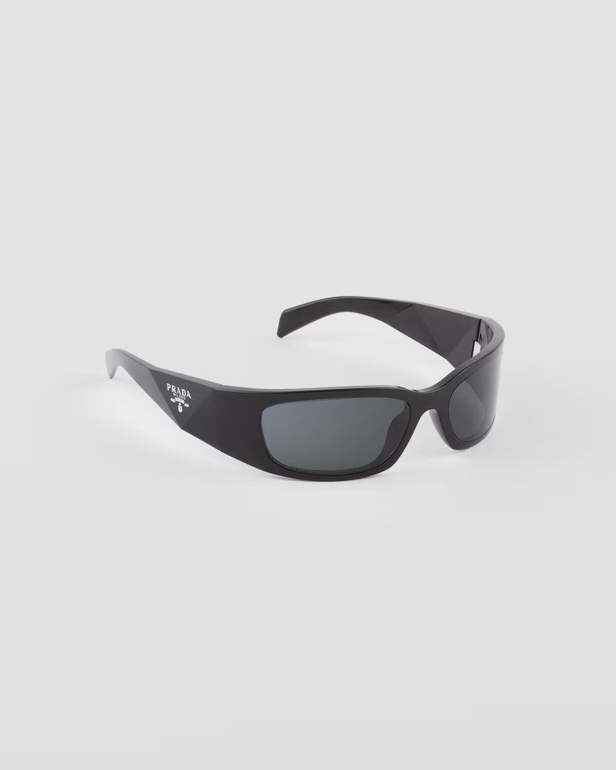 These new Prada Symbole sunglasses feature enveloping, contemporary lines. The three-dimensional crafting of the temples creates bold geometric shapes marked by an iconographic interpretation of the iconic Prada triangle logo.