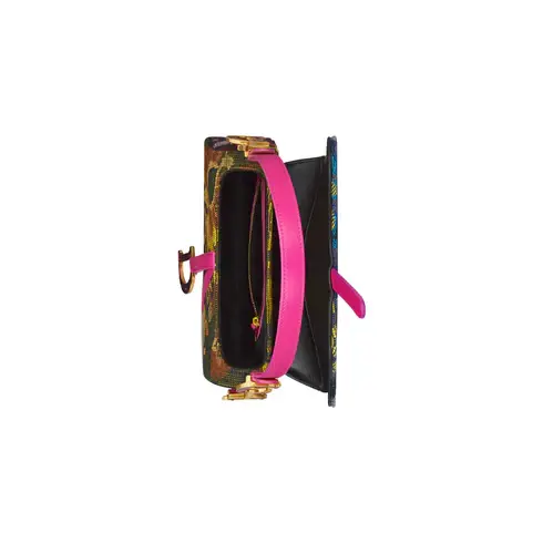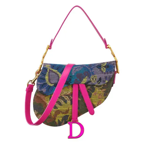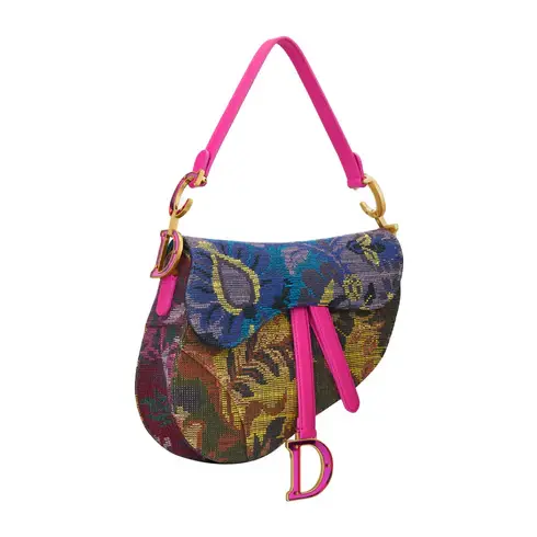 • Maria Grazia Chiuri brings a fresh update to the iconic Saddle bag. The legendary design is entirely embroidered in multicolor, cotton cross-stitched Jardin Indien motif celebrating Indian-inspired plants in bright colors. The Saddle flap has a D stirrup clasp on a magnetic strap with pulls, as well as an antique gold-finish metal and transparent pink resin CD signature on either side of the strap. Equipped with a thin, adjustable and removable strap, the Saddle bag may be carried by hand, worn over the shoulder or crossbody.
