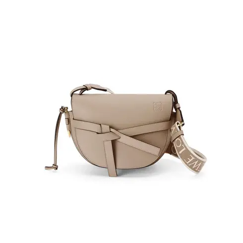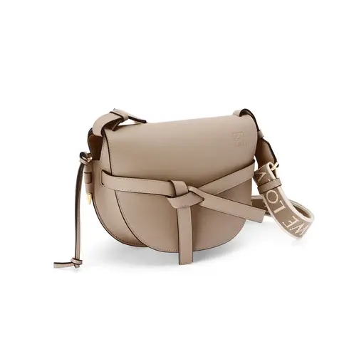 Meticulously crafted in soft calfskin, the Gate Dual displays LOEWE´s unrivalled leather craftsmanship with a saddle-stitched knotted leather strap and a side-latched metal pin that gives the bag its name. This small version has a adjustable shoulder strap in calfskin and jacquard with a repeat LOEWE pattern.