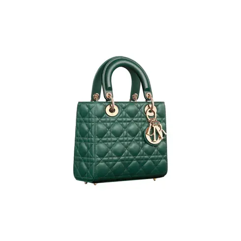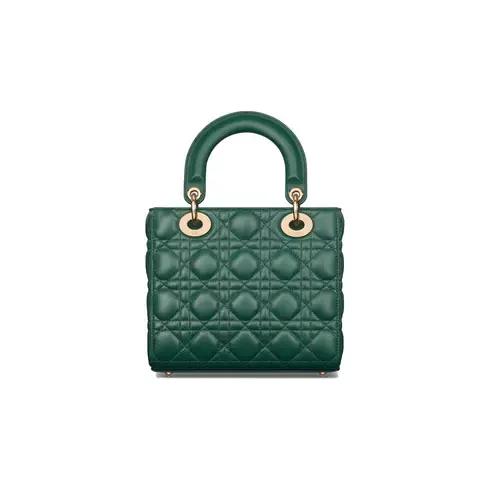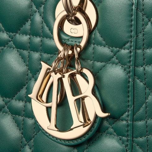 • The Lady Dior My ABCDior bag epitomizes the House's vision of elegance and beauty. Sleek and refined, the timeless style is crafted in pine green lambskin with Cannage stitching, creating the instantly recognizable quilted texture, while the pale gold-finish metal D.I.O.R. charms embellish and illuminate the silhouette. Featuring a shoulder strap that can be customized by adding badges, the small, unique style may be carried by hand or worn crossbody.