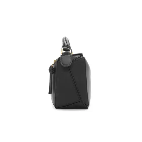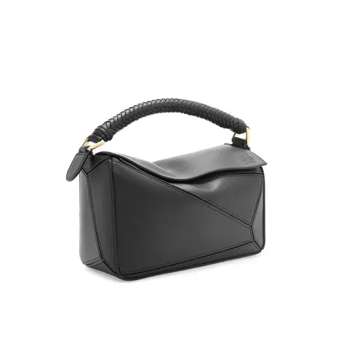 A cuboid shape and precise cutting technique create Puzzle's distinctive geometric lines. This version is crafted in mellow calfskin, with a distinctive woven handle.