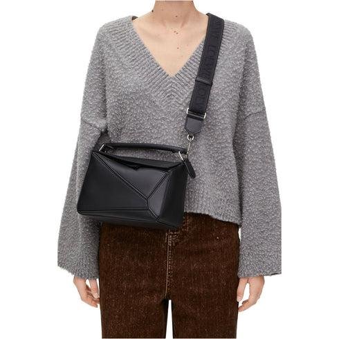 • A cuboid shape and precise cutting technique create Puzzle's distinctive geometric lines. This small version is crafted from satin calfskin.