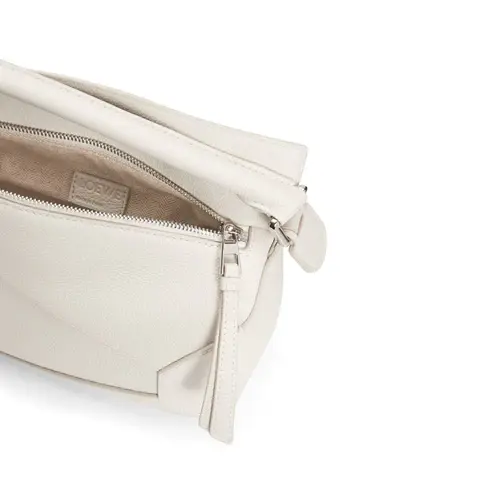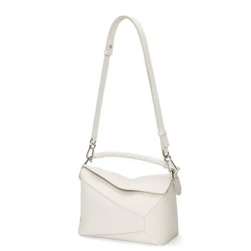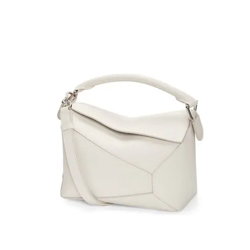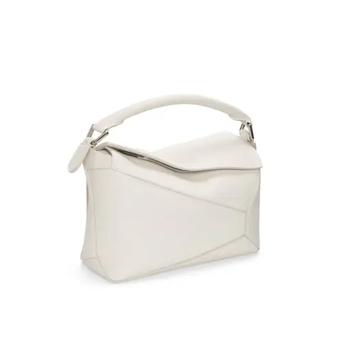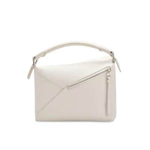 A cuboid shape and precise cutting technique create Puzzle’s distinctive geometric lines. This small version is crafted in soft grained calfskin with overlapped edges.